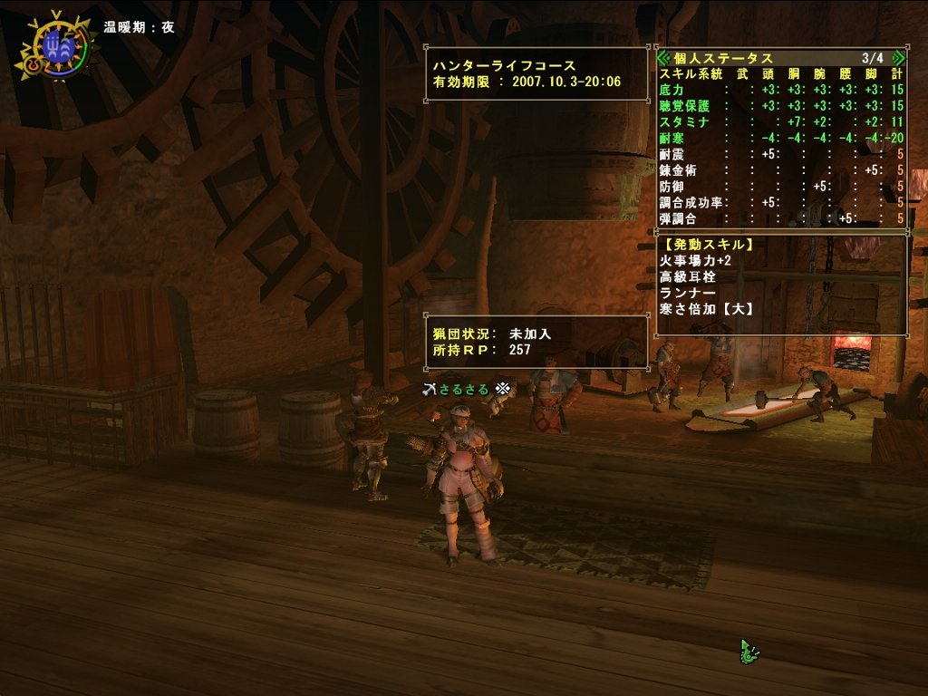 無事、火事場力+2、ランナー、高級耳栓装備ができましたー。